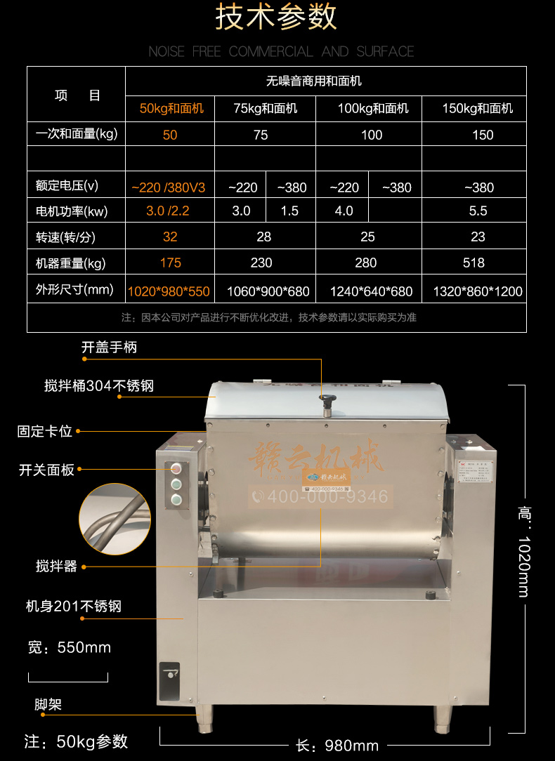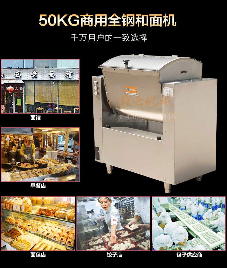 全鋼和面機,工程系列50kg和面郎,整機外殼不銹鋼材質,絞龍和和面桶均為食品級不銹鋼,安全衛生,適合中央廚房面點加工,面食加工廠生產和面攪拌之用。本系列產品有25kg和50kg兩種款式