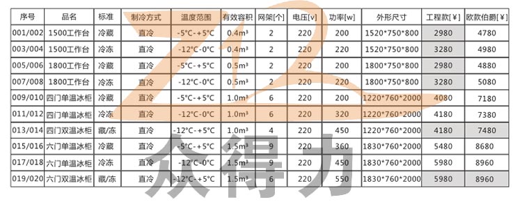 眾得力廚具提供中央廚房設備一站式采購,冷藏冷凍柜分為帶操作臺和不帶操作臺,帶操作臺有1.5米冷藏柜、1.5米冷凍柜,1.8米冷藏柜和1.8米冷凍柜。不帶操作臺的為四六門單溫、雙溫系列冷藏冷凍柜,歡迎選購