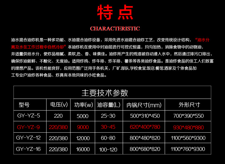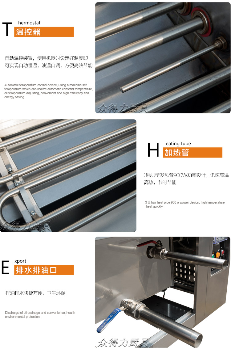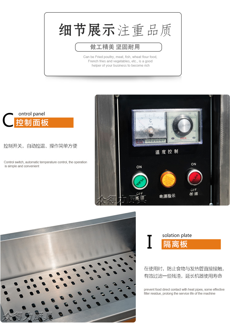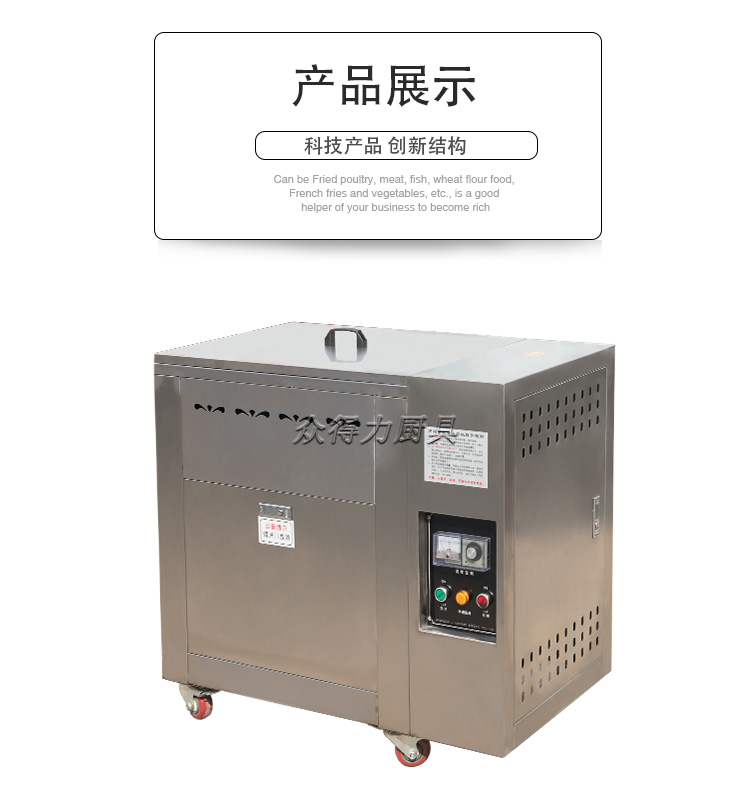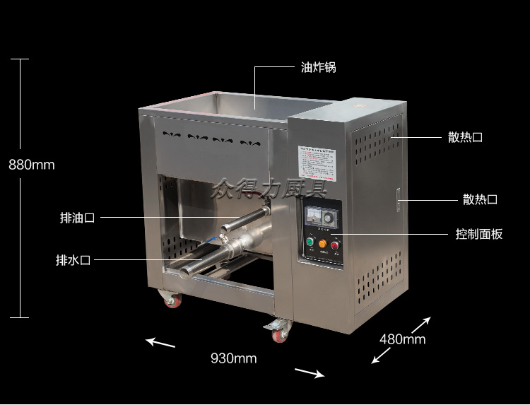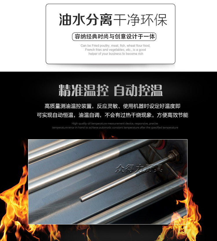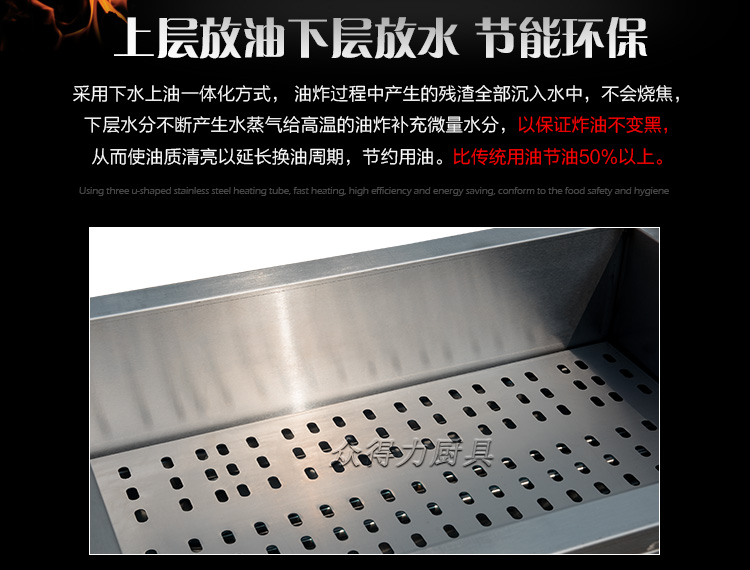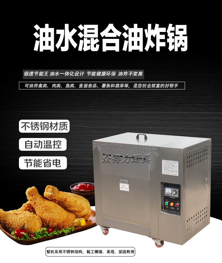 眾得力旗下產品油炸系列,不銹鋼電熱節(jié)能油水分離油炸爐,油炸機,YZ系列油炸爐,電加熱,節(jié)能油水分離油炸一體爐,油水過濾,確保油炸物能100%油炸,殘留物通過水過濾,拒絕一直油炸。油炸不變黑,炸出來的食品外形美觀
