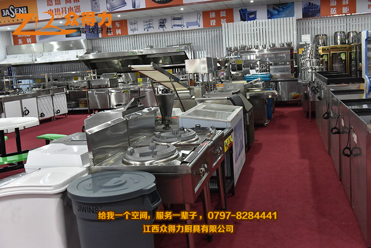 眾得力廚具,給我一個空間,服務一輩子!江西眾得力廚具有限公司產品展廳一角,專注廚房設備,為贛州地區提供各種小吃設備、早餐設備、自動調湯設備、米面加工設備、火鍋店設備、酒店用品、調理品等系列商用廚具,并為餐飲食品企業提供整體規劃及解決方案。