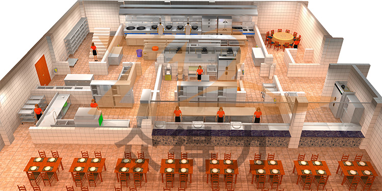 江西眾得力廚具有限公司生產(chǎn)銷售高端廚具,廚房設(shè)備,食品機(jī)械等,承接中央廚房設(shè)備生產(chǎn)、銷售、設(shè)計、施工、安裝、調(diào)試、培訓(xùn)一站式服務(wù),提供廚房整體3D效果圖,本3D效果圖為政企單位/學(xué)校食堂中央廚房整體效果:涉及的設(shè)備:四層疏條貨架、大炒爐、小炒爐、海鮮蒸柜、蒸飯柜、煲仔爐、湯爐、打荷臺、儲物柜、組裝式操作臺、壓面機(jī)、攪拌機(jī)、和面機(jī)、煮面爐、四門儲物柜、保溫售飯臺、全自動洗碗機(jī)、餐車、收碗車、收殘車、洗手池、雙溫冰柜、油煙凈化設(shè)備,排煙管道等系列商用廚具和食品機(jī)械設(shè)備。