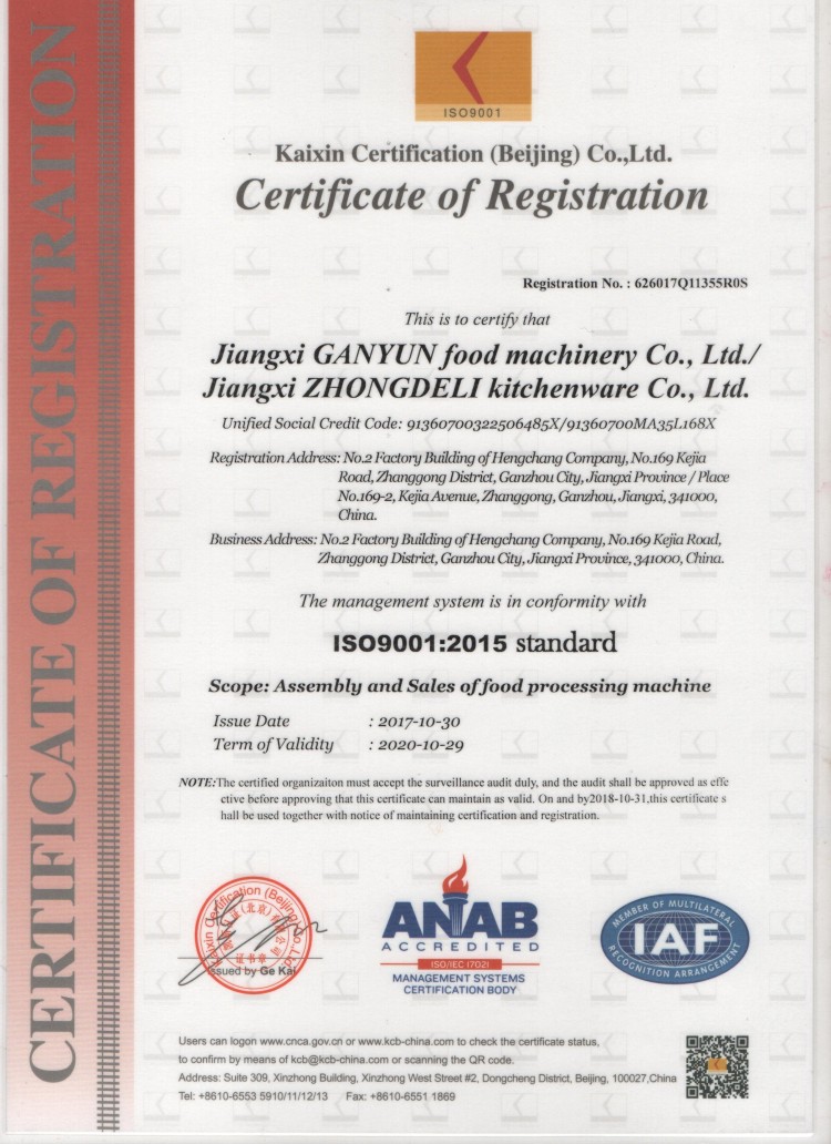 江西眾得力廚具有限公司順利通過ISO9001質量管理體系認證【中文版、英文版】
